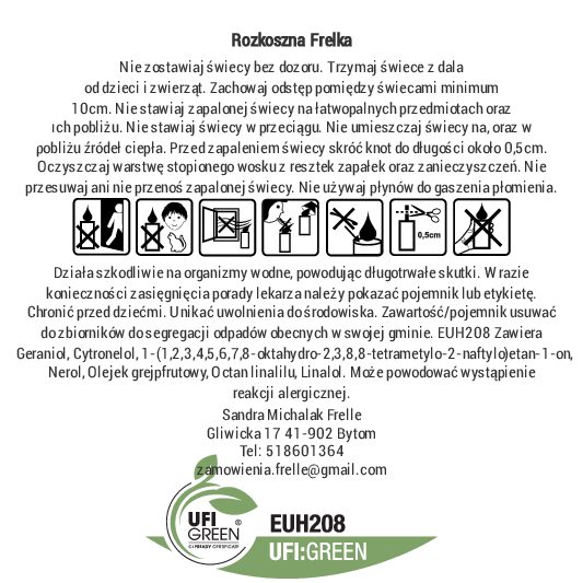 Ręcznie wylewana – każda Frelka tworzona jest z dbałością o detale, dzięki czemu każda świeca ma unikalny charakter.
